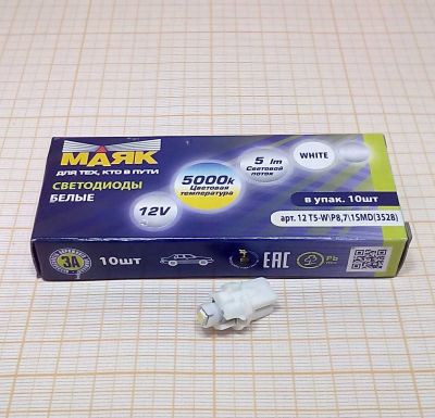 Светодиод T 5 12V 1,2W WHITE 1SMD МАЯК безцокольная с патроном (панель приборов)