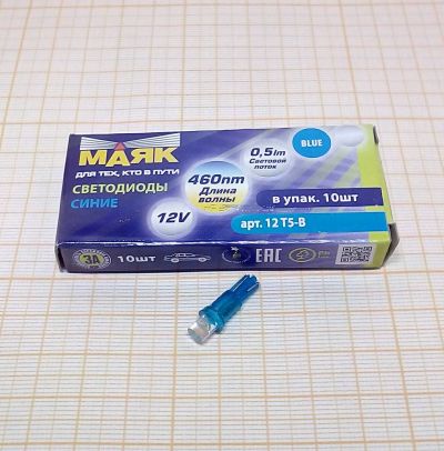 Светодиод T 5 12V 1,2W BLUE 1SMD МАЯК 2.0х4.6d безцокольная (панель приборов)